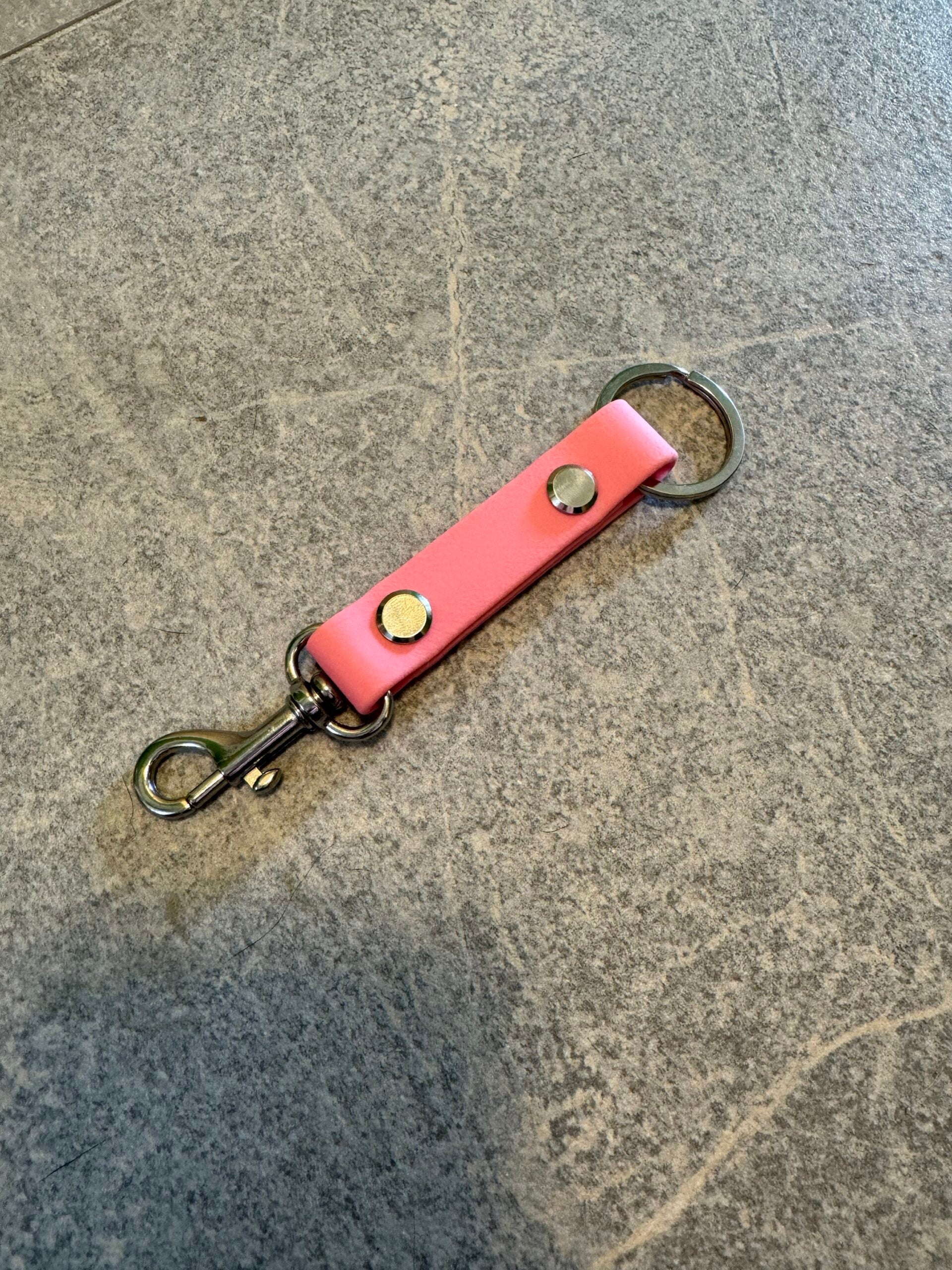 Den är gjord av en pistol hake som är 45 mm lång. Och rosa biothane som är 70 mm. Och en nyckelring som är 30 mm i diameter.